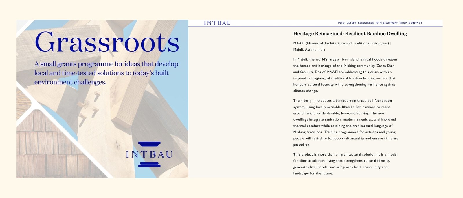MAATI is honoured to announce a major international achievement: the firm has been selected as one of the top five projects worldwide (out of over 300 entries) for the prestigious INTBAU Grassroots Grant Award 2025. This highly competitive award includes a £5,000 grant to support the project “Heritage Reimagined: Resilient Bamboo Dwelling,” located in Majuli, Assam, India. This initiative, led by Ar. Zarna Shah and Sanjukta Das of MAATI are dedicated to reimagining traditional bamboo housing to strengthen resilience against annual flood threats and climate change while honouring the cultural identity of the Mishing community. The innovative design uses locally available Bhaluka Bah bamboo to create durable, low-cost, and thermally comfortable dwellings. This achievement underscores MAATI’s commitment to creating models for climate-adaptive living that safeguard cultural identity and generate future livelihoods.